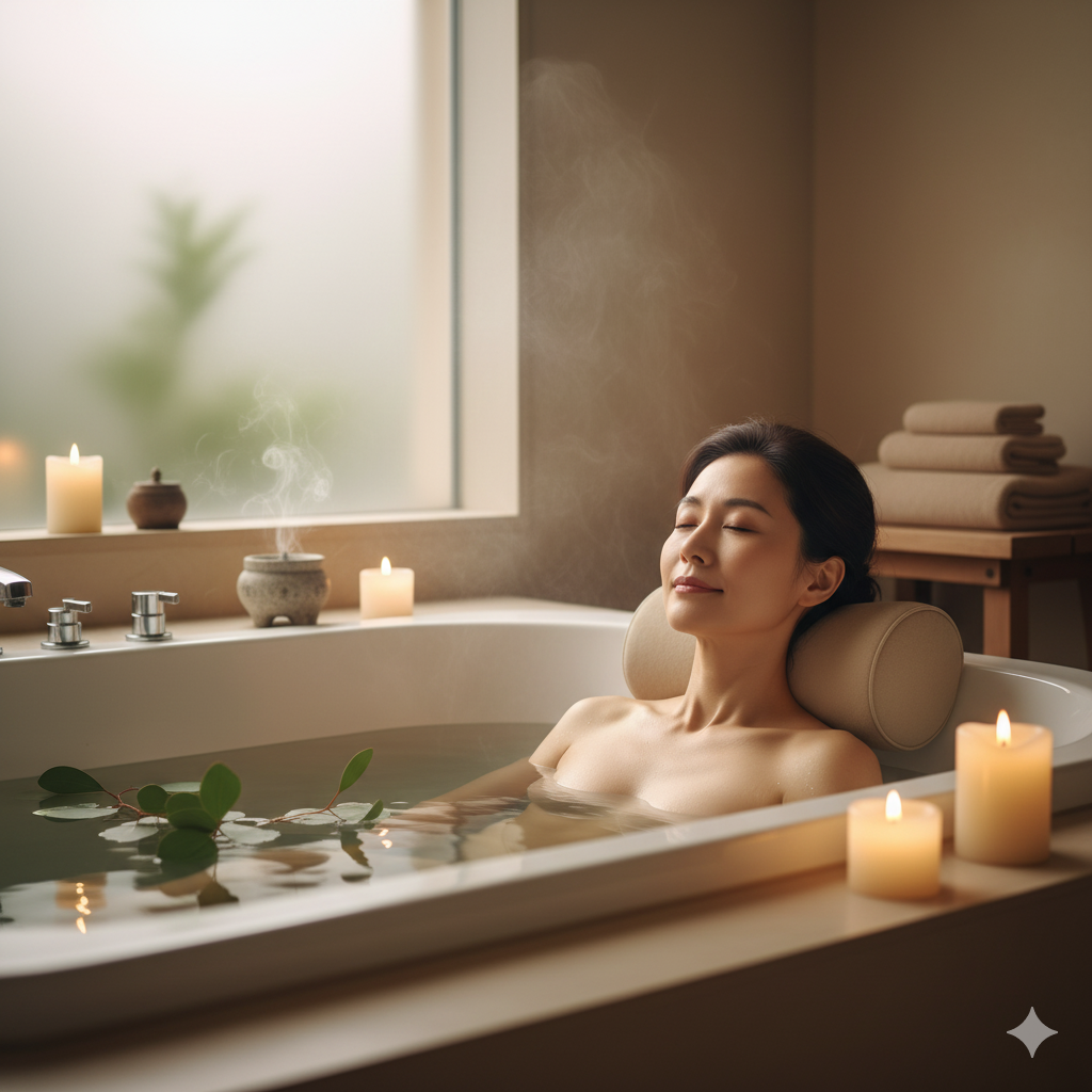 • 실천 가이드: 체온과 비슷한 38~40°C의 미지근한 물15분 이내로 명치 아래까지만 담그는 반신욕이 가장 좋습니다. 미온수 반신욕은 혈류량을 증가시키면서도 혈압을 급격히 올리지 않아 심장에 부담이 적고, 근육 이완과 스트레스 완화에 탁월합니다. 목욕 후에는 물기를 완전히 말리고 보습제를 바르는 것이 중요합니다.